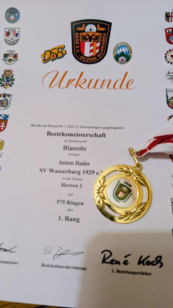Am 8. und 9. November 2025 trafen sich zahlreiche Blasrohrsportlerinnen und -sportler zur Bezirksmeisterschaft Schwaben im Blasrohrschießen, die beim Schützenverein Edelweiß Schwenningen ausgetragen wurde. Der Verein sorgte mit hervorragender Organisation und einem freundlichen Ambiente für einen rundum gelungenen Wettkampf, der sowohl sportlich als auch gesellschaftlich ein echtes Highlight darstellte.